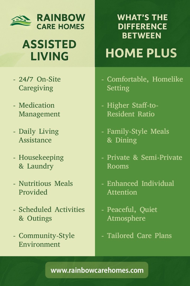 A home plus is a licensed residential setting designed to provide long-term care for up to 12 residents. Unlike larger facilities, home plus living allows residents to enjoy the comfort of a real home while still receiving the daily assistance, supervision, and care they need. At Rainbow Care Homes, our team focuses on maintaining dignity, independence, and quality of life while offering support tailored to each resident.