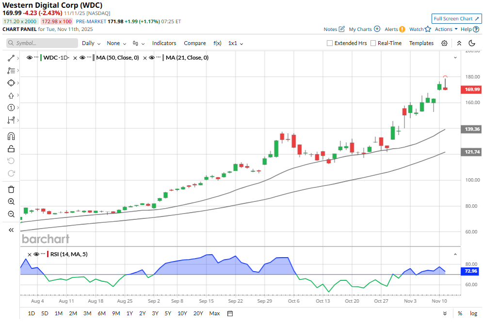 Western Digital (WDC) stock has skyrocketed nearly 280% this year and is the top performer in the S&P 500 Index ($SPX). The driving force behind this stellar rally is the strong artificial intelligence (AI)-driven demand for its storage solutions.